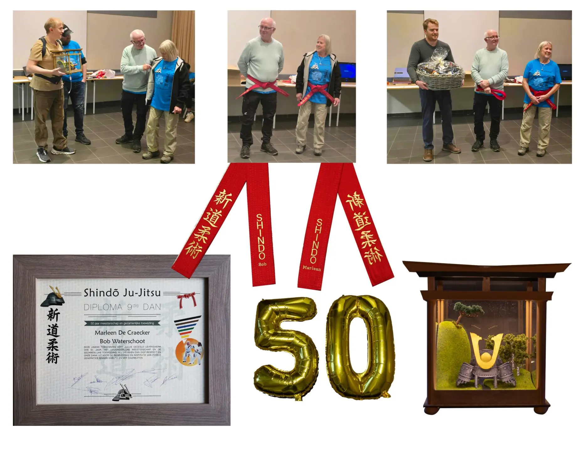 De uitreiking werd verzorgd door onze eigen zwarte gordels, onder leiding van hun zoon Tim, zelf houder van de 6de dan. Het moment werd extra speciaal door het overhandigen van een uniek driedimensionaal kunstwerk, gemaakt door hun zoon Jon, Master in de schilderkunst.